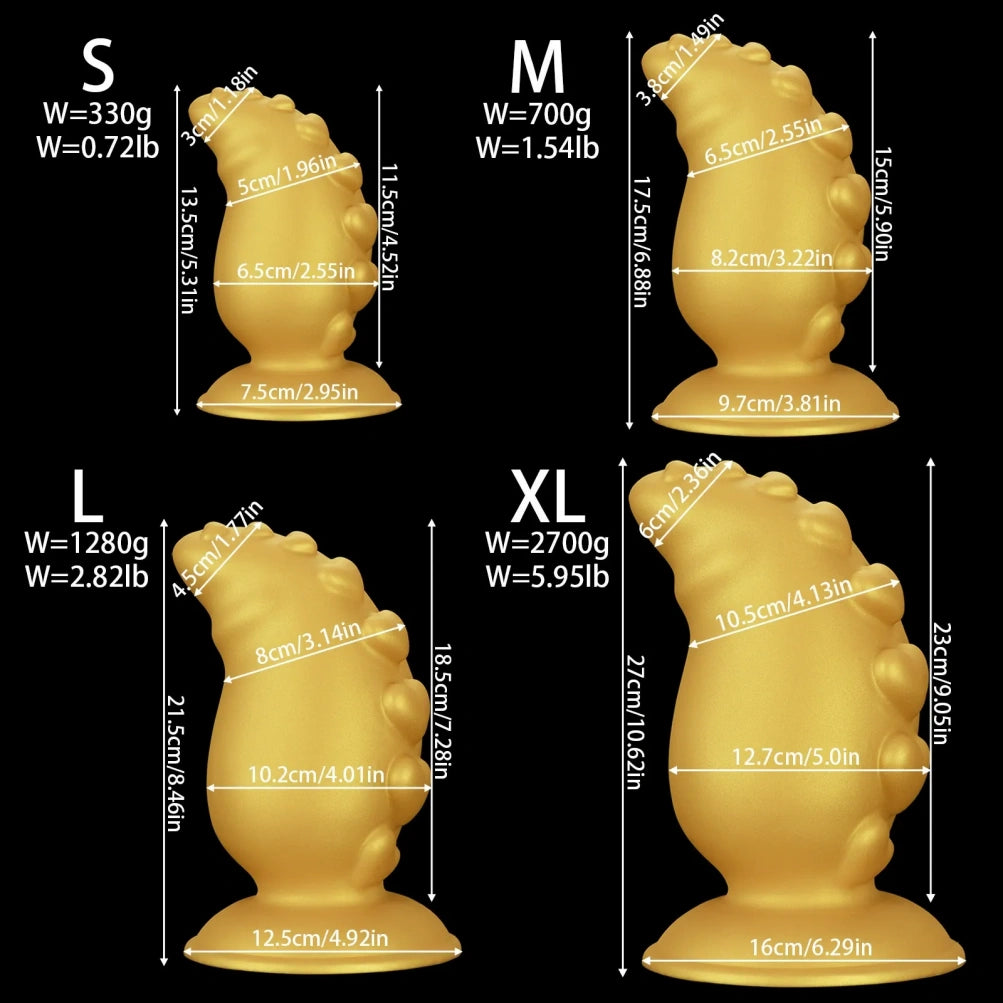A: Dies ist in erster Linie ein sehr großer Dildo, der zur Dehnung konzipiert ist. Wenn Sie noch keine Erfahrung mit großen Sexspielzeugen haben, empfehlen wir Ihnen, mit der kleinsten der vier verfügbaren Größen zu beginnen und reichlich Gleitmittel zu verwenden.