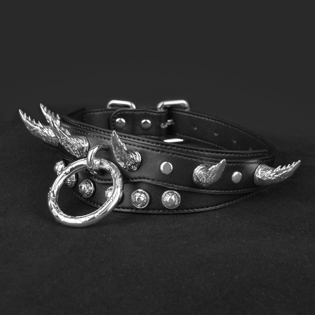 Dieses Halsband ist eine kraftvolle Mischung aus hochwertigen Materialien und ausgefallenem Design und vermittelt ein Gefühl dunkler Eleganz und kontrollierter Aggressivität.