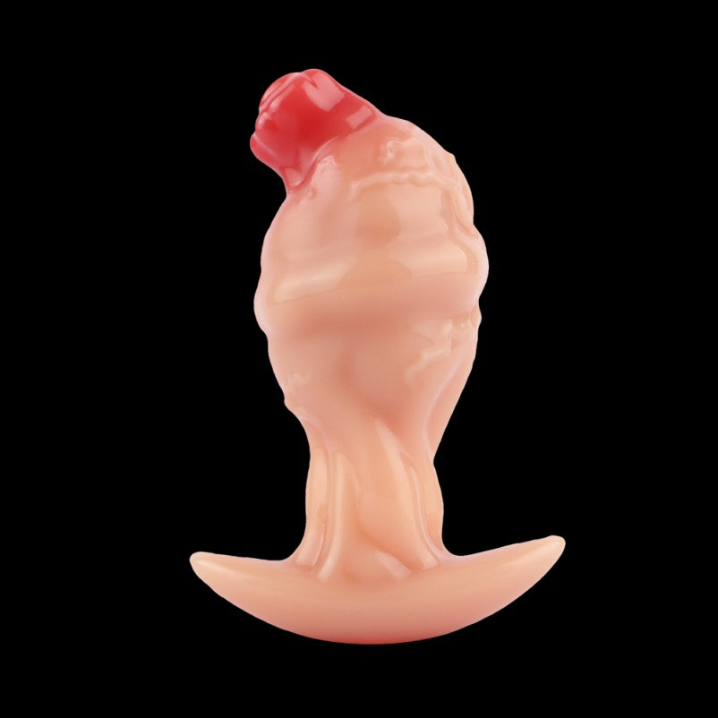La base est une large plateforme incurvée ou en forme de cuvette conçue pour assurer stabilité et sécurité lors de l'insertion. La partie du plug anal est sculptée selon une forme biomorphique irrégulière et profilée, pas complètement lisse, et peut présenter des textures ou des plis naturels.