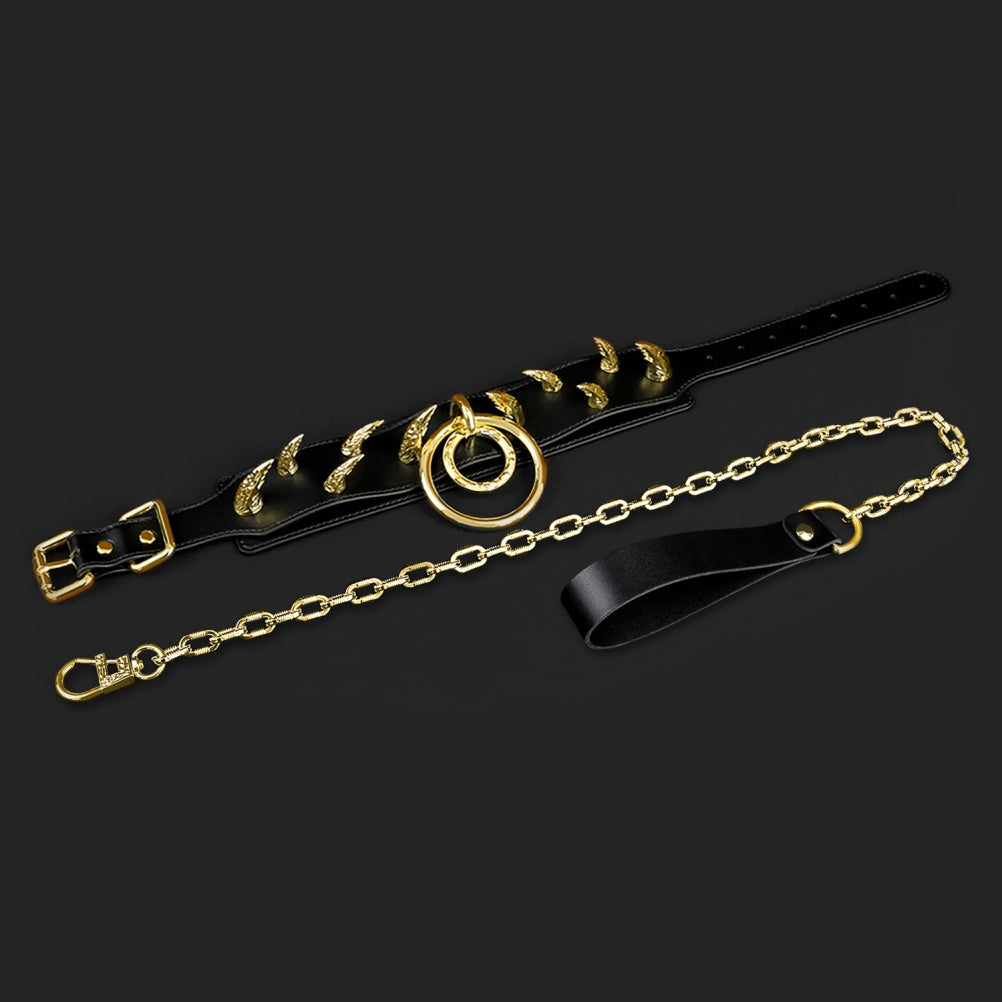 Ce collier de bondage haut de gamme présente un design saisissant : un tour de cou en cuir noir résistant orné d'imposantes griffes ou pointes métalliques dorées ou argentées. Ces ornements intimidants rappellent les serres d'un prédateur mythique.