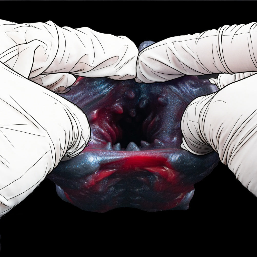 Sculpted in a dark, iridescent alien aesthetic with crimson-teal marbled platinum silicone. Every ridge, spike, and internal channel was engineered to deliver layered, escalating pleasure that standard masturbators simply can't replicate.